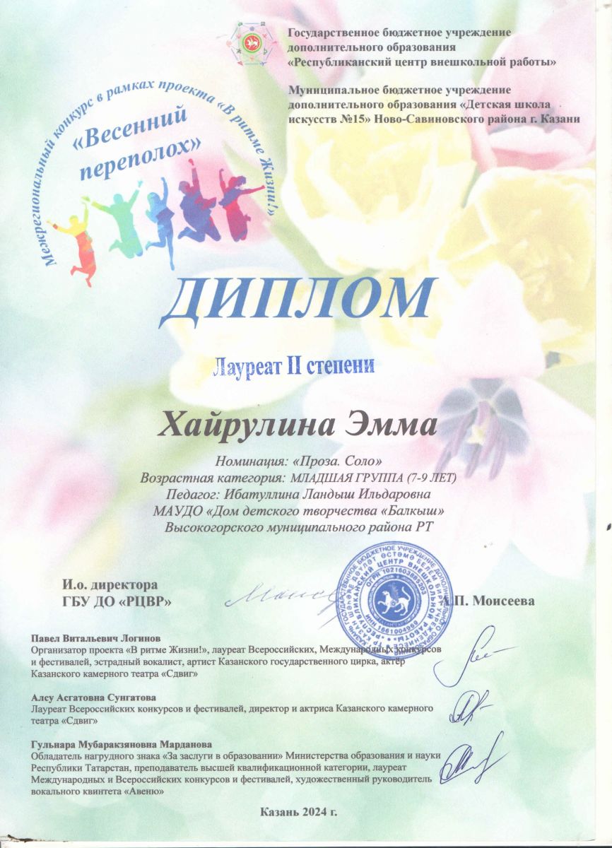 Межрегиональный конкурс "Весенний переполох" - Хайруллина Эмма, лауреат 2 степени