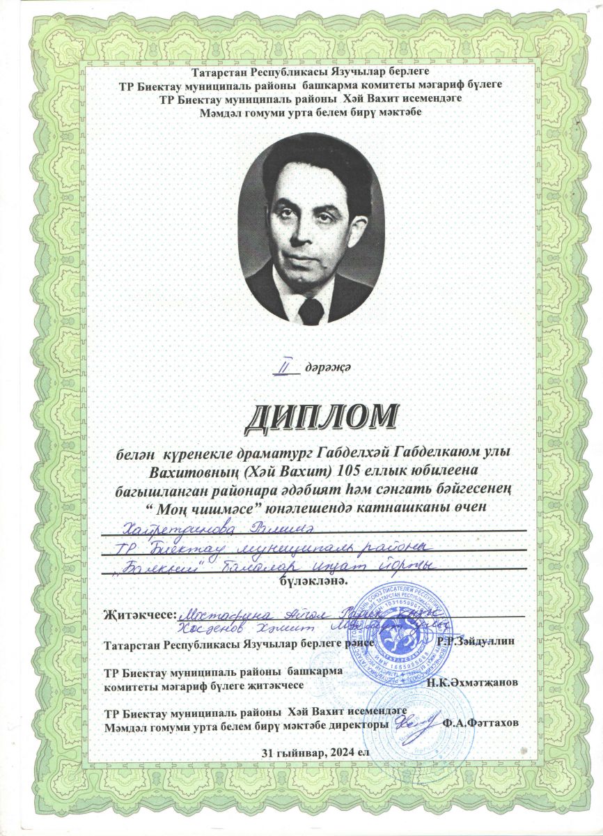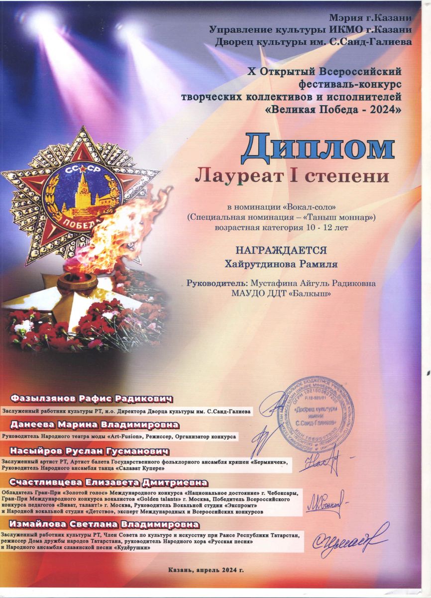 X Всероссийский фестиваль-конкурс "Великая Победа - 2024"- Хайрутдинова Рамиля, лауреат 1 степени