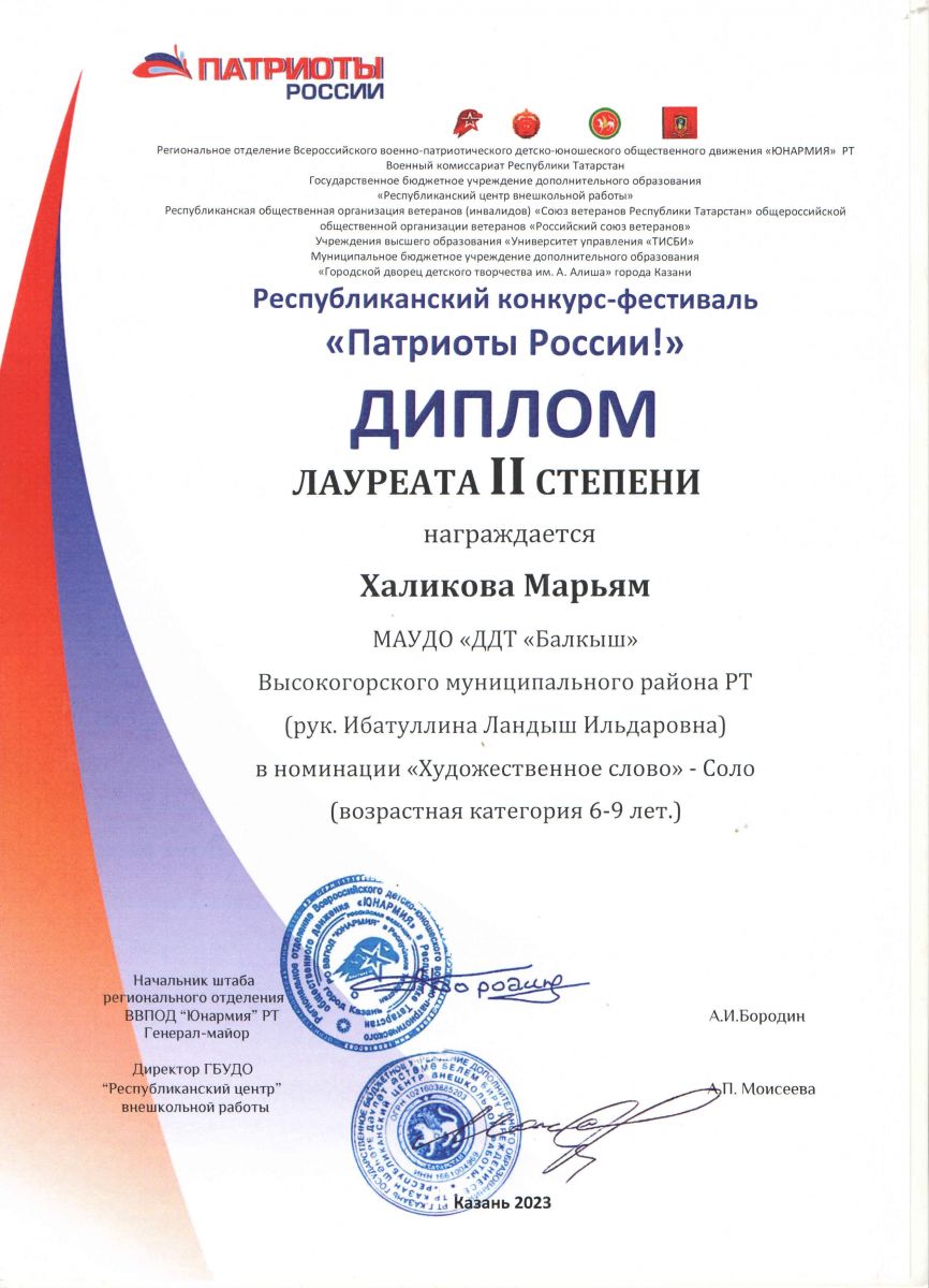 Республиканский конкурс-фестиваль "Патриоты России!" - Халикова Марьям, лауреат 2 степени