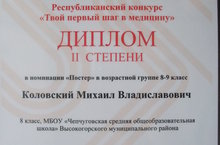 Ученик 8 класса Коловский Михаил занял второе место в республиканском конкурсе «Твой первый шаг в медицину»