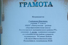 Ученица 9 класса Гладышева Кристина заняла 2 место в районном конкурсе исследовательских работ, посвященных 70-летию Победы.
