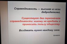 Справедливость — это понятие, которое включает в себя честность, равенство и неподкупность. Мы обсудили, как важно учитывать интересы всех, а не только свои. Справедливость подразумевает, что все люди имеют равные права и возможности, и никто не должен страдать из-за предвзятости или несправедливого обращения. -