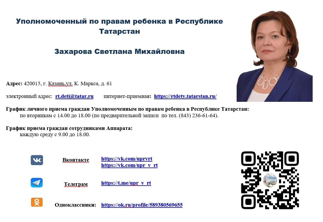 Уполномоченный по правам ребёнка по Республике Татарстан Захарова Светлана Михайловна