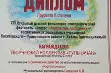 Воспитанники нашего детского сада были награждены Дипломом 2 степени за участие в 16-м Открытом детском фольклорно-этнографическом фестивале-конкурсе "Апрельские проталинки" в номинации "Сценическое действие" за исполнение композиции "Карга боткасы".