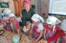 Сегодня в нашем детском саду прошел праздник, посвященный татарской нацинальным блюдам. Ребята сначала с помощью презентации познакомились с видами татарской национальной выпечки. Потом воспитатель подготовительной группы Мингазова А. Р. показала мастер-класс по приготовлению татарских мучных блюд. Девочки подготовительной группы научились раскатывать тесто, делать из него различные формы (розочки, гусиные лапки, сердечки). Затем все эти заготовки выпекали в духовке и устроили угощение для всей группы. В гости на этот праздник пришла уважаемый ветеран нашего села Адаева Гульсум.