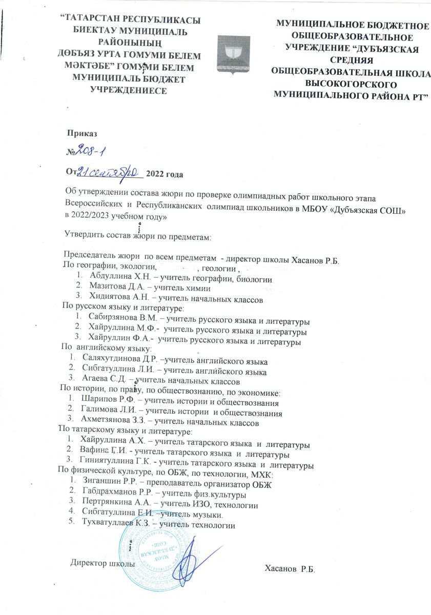 Приказ о проведении ШЭ ВОШ и РОШ в МБОУ "Дубъязская СОШ" в 2022/2023уч.году
