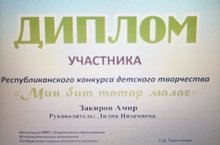 Мы с Закировым Амиром приняли участие в конкурсе"Мин бит татар малае " и получили диплом.