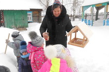 Без балалар белән саф һавага чыккач бездә кышлаучы кошлар өчен җимлеккә җим салабыз. Җимлеккә килгән кышчыкларны күзәтәбез. Аларның исемнәрен дә кабатлыйбыз