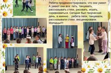 Ребята продемонстрировали, что они умеют. А умеют они все: петь, танцевать, рассказывать стихи, рисовать, играть, соревноваться. Сегодня был творческий день, а именно... ребята пели, танцевали, рассказывали стихи, инсценировали. Молодцы!!!