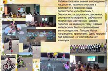 Сегодня ребята показали знания в поведении на дорогах, приняли участие в викторине о правилах БДД, посмотрели мультфильмы о безопасности дорожного движения, рисовали на асфальте, работали в творческих мастерских - делали поделки на заданную тему.Самым интересным было соревнование велосипедистов. Лучшие были награждены грамотами. День прошёл под девизом: «У светофора нет каникул»