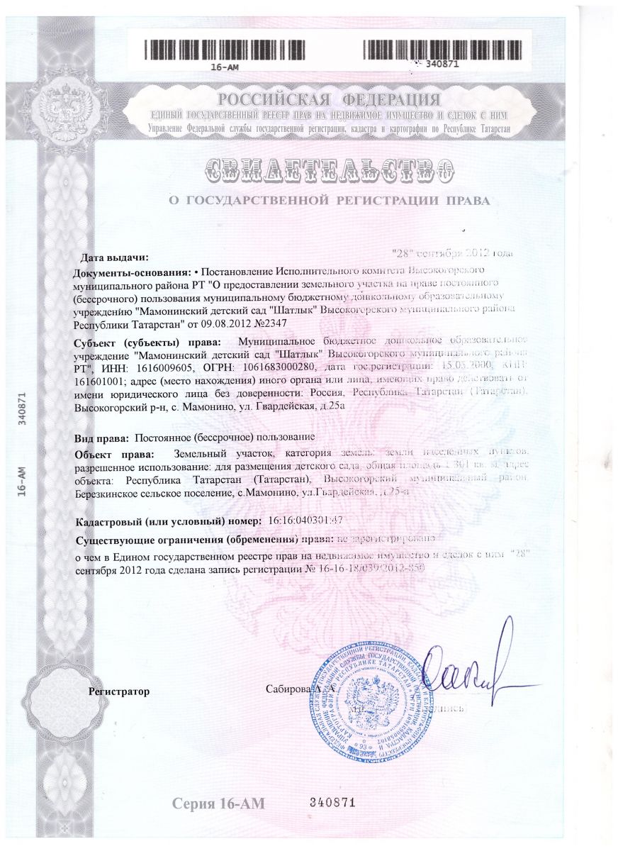 | Адрес: | Республика Татарстан, Высокогорский район, село Мамонино, ул. Гвардейская, д. 25а |