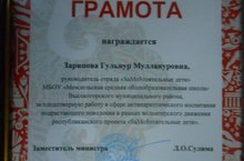 Руководитель отряда «SаМоSтоятельные дети» Зарипова Гульнур Муллануровна награждена ГРАМОТОЙ Министерства Образования и Науки РТ за плодотворную работу в сфере антинаркотического воспитания подрастающего поколения в рамках волонтёрского движения республиканского проекта «SаМоSтоятельные дети». Поздравляем!!!