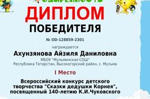 Ученица первого класса Ахунзянова Айзиля заняла первое место во Всероссийском конкурсе детского творчества сказки Дедушки Корнея.Поздравляем нашу победительницу и желаем дальнейших успехов. Руководитель Сафина Э.С.