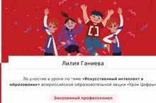 С 27 сентября по 9 октября учащиеся нашей школы участвовали во всероссийской акции "Урок цифры". Были проведены уроки с учащимися 1-11 классов по теме "Искусственный интеллект в образовании". Учащиеся получили сертификаты.
