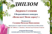 Поздравляем преподавателя теории музыки нашей ДШИ -Солнику Наталью Николаевну,ставшую Лауреатом I степени I Всероссийского конкурса " Весна идёт! Весне дорогу!"