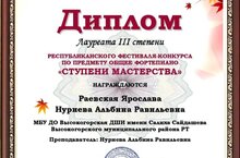 Учащаяся нашей школы, многократный победитель и лауреат всевозможных конкурсов, Раевская Ярослава, стала лауреатом 3 степени Республиканского фестиваля- конкурса по общему фортепиано "Ступени мастерства", преп. Нуриева А. Р.) Поздравляем !Молодец!Желаем дальнейших успехов и побед!