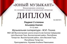 Поздравляем Алькаеву Азалию, ставшую Лауреатом 2 степени Международной олимпиады по слушанию музыки и музыкальной литературы "Юный музыкант"!