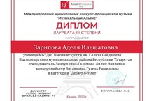Закирову Элину (преп. Зиадуллина - Галлямова Лилия Наиловна, концерт-р Могилюк Антон Игоревич) с Дипломом Дипломанта I степени Международного музыкального конкурса французской музыки "Музыкальный Альянс"!