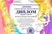 Поздравляем Дуэт - Яковлев Григорий и Раевская Ярослава, ставшие Лауреатами I степени VII Республиканского фестиваля - конкурса"ПРОРЫВ" в рамках проекта "В ритме Жизни!". Преподаватель Агеева Надежда Владимировна и концертмейстер Фатхутдинова Татьяна Геннадьевна были награждены Благодарственными письмами.