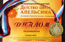 Поздравляем Сахбиева Айрата, преподаватель Гильманова Г. З., ставшего Дипломантом 1 степени Международного конкурса "Детство цвета Апельсин".
