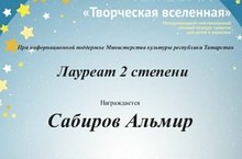 Поздравляем Сабирова Альмира, учащегося по классу вокала с победой - Лауреат II степени Международного многожанрового заочного конкурса талантов для детей и взрослых "Творческая Вселенная", при информационной поддержке Министерства Культуры Республики Татарстан, преподаватель Сибгатуллина Елена Илларионовна, г. Тюмень, апрель 2021 года.
