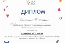 Поздравляем Романову Анастасию, учащуюся по классу фортепиано, преподаватель Зиганшина Гузель Рашидовна, с Дипломом III степени III -го Республиканского конкурса фортепианной музыки "Созвездие талантов", проходившего в рамках проекта "100/ЛИЦА", в номинации "Детская академия". Управление культуры исполнительного комитета города Казани при поддержке Министерства культуры Республики Татарстан, 13 марта 2021 года.