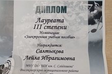 Поздравляем Салтыкову Лейлу Ибрагимовну с Дипломом Лауреата 3 степени в номинации "Электронное учебное пособие" на 6 Международном конкурсе художественного творчества в сфере музыкально-компьютерных технологий, мультимедийных проектов, электронных и печатных учебных пособий, печатных работ и музыкальных композиций "Классика и современность". желаем дальнейших успехов!!!