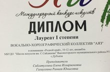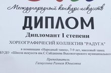 Поздравляем хореографический коллектив "Радуга" и его руководителя Галиуллину Рамилю Юнысовну, ставшими дипломантами 1 степени на Международном конкурсе искусств в номинации "Народный танец", 7-9 лет. Поздрапвляем!!! Желаем дальнейших побед!!!