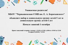 Уважаемые родители! МБОУ "Чернышевская СОШ им. Е.А. Боратынского" объявляет набор в дошкольную группу летей 5 и 6 лет. Начало занятий 1 октября.