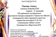 26 октября 2017 года в Высокогорском РДК состоялся традиционный фестиваль "Ватан", посвящённый Дню народного единства. Павлова Алекса, учащаяся 6 класса нашей школы заняла 2 место с песней "Я люблю тебя, Россия!" Руководитель Абдуллина В.И. Поздравляем, желаем дальнейших творческих успехов!