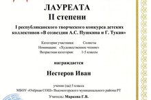 13 мая 2017 года в г. Казани состоялся I республиканский творческий конкурс детских коллективов «В созвездии А.С.Пушкина и Г.Тукая», на котором Нестеров Иван, учащийся 5 класса нашей школы получил Диплом лауреата II степени. Руководитель- Маркова Г.В., учитель русского языка и литературы. Поздравляем с победой! Желаем дальнейших творческих успехов!