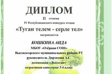 В г.Нижнекамске прошёл IV Республиканский конкурс чтецов “Туган телем- серле тел”. Наши учащиеся: Кошкина Аида, из 5 класса, Аскарова Айзиряк из 2 класса завоевали на нём Дипломы II степени в номинации “Экология». Руководители Дирзизова А.С., Губайдуллина Я.Ф.
