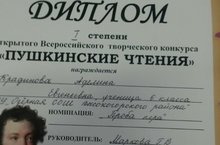 22 марта 2017 года в г. Набережные Челны состоялся Всероссийский творческий конкурс «Пушкинские чтения». Крадинова Аделина, учащаяся 6 класса нашей школы завоевала Диплом I степени в номинации «Проба пера». Руководитель Маркова Г.В.
