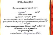 15 февраля 2017 года в Дубъязской СОШ состоялся районный конкурс среди военно- патриотических клубов общеобразовательных учреждений Высокогорского муниципального района Республики Татарстан. Наш школьный военно- патриотический клуб «Родина» под руководством Минуллина Р.Р. достойно выступил на данном конкурсе, заняв первые места в спортивной программе «Готов к труду и обороне» и интеллектуальной викторине «Надёжный щит Отечества». Поздравляем ребят! Так держать!