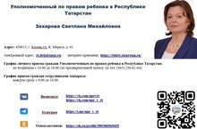 Постановлением Государственного Совета Республики Татарстан «О назначении на должность Уполномоченного по правам ребенка в Республике Татарстан» № 378-VII ГС от 25 сентября 2025 Захарова Светлана Михайловна назначена на должность Уполномоченного по правам ребенка в Республике Татарстан. / «Татарстан Республикасында Бала хокуклары буенча вәкаләтле вәкил вазыйфасына билгеләп кую турында» Татарстан Республикасы Дәүләт Советының 2025 елның 25 сентябрендәге 378-VII ДС номерлы карары белән Захарова Светлана Михайловна Татарстан Республикасында Бала хокуклары буенча вәкаләтле вәкил вазыйфасына билгеләп куелды.