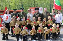 В нашем детском саду сегодня состоялся торжественный Парад Победы дошкольников./ Безнең балалар бакчасында бүген мәктәпкәчә яшьтәге балаларның Җиңү Парады узды.