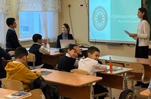 Сегодня в 5 «Б» классе ученица 10 «А» класса Файзрахманова Аделя провела урок посвящённый ко дню Конституции.