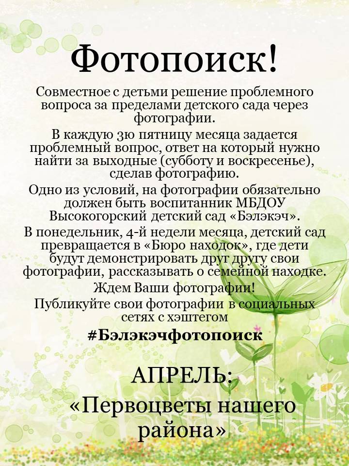Опубликовано: 11.04.2023В рамках месячника #ЭКОВЕСНА2023 наш детский сад запускает "Фотопоиск"- подробности читайте