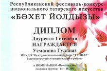 Республиканский фестиваль- конкурс национального татарского искусства "Бэхет йолдызы" .Поздравляем Усманову Гульназ дипломом лауреата 1 степени, рук. Багавиева Ф.Р.