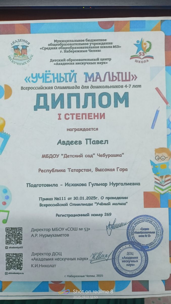 Диплом 1 степени во Всероссийской олимпиаде дошкльников "Ученый малыш" 2025г.
