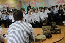 В ходе встречи ребята увидели бронежилет, побывавший в боевых действиях, солдатский рюкзак и боевые медали.