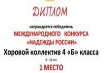 Награждается 4 б класс победитель Международного конкурса "Надежды Россси" 1 место