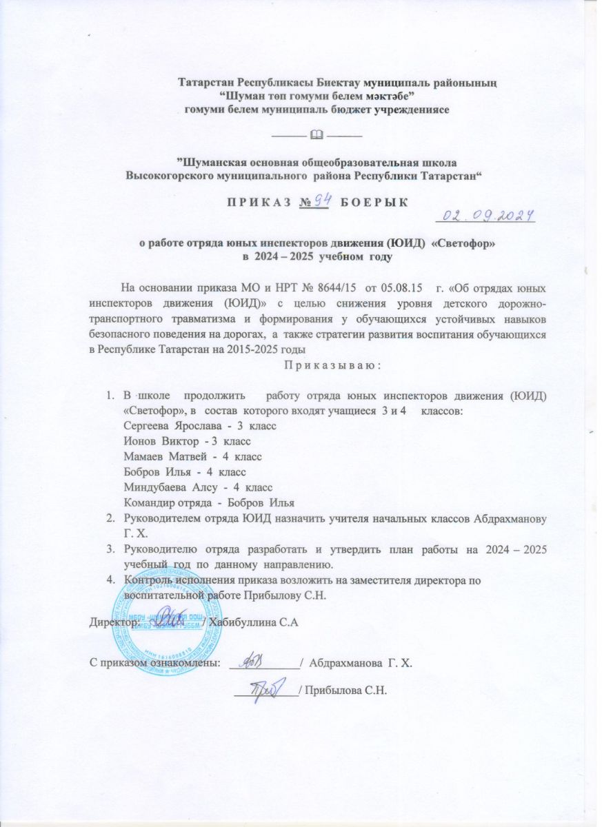 Приказ о работе отряда ЮИД на 2024-2025 учебный год