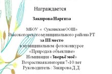 Учащаяся 2 класса Закирова Наргиза в фотоконкурсе "Природа в объективе" заняла 3 место в номинации "Зверьё мое". Поздравляем Наргиза с очередной победой!