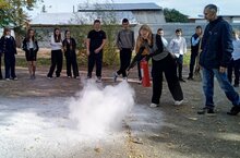 С учениками 7 классов в количестве 27 человек после пожарной тревоги было проведено практическое занятие «Тушение возгорания». На подготовленной площадке был разведен огонь, который ученики тушили, используя порошковый огнетушитель ОП-5. В результате практического занятия ученики получили навык пользования огнетушителем ОП-5.