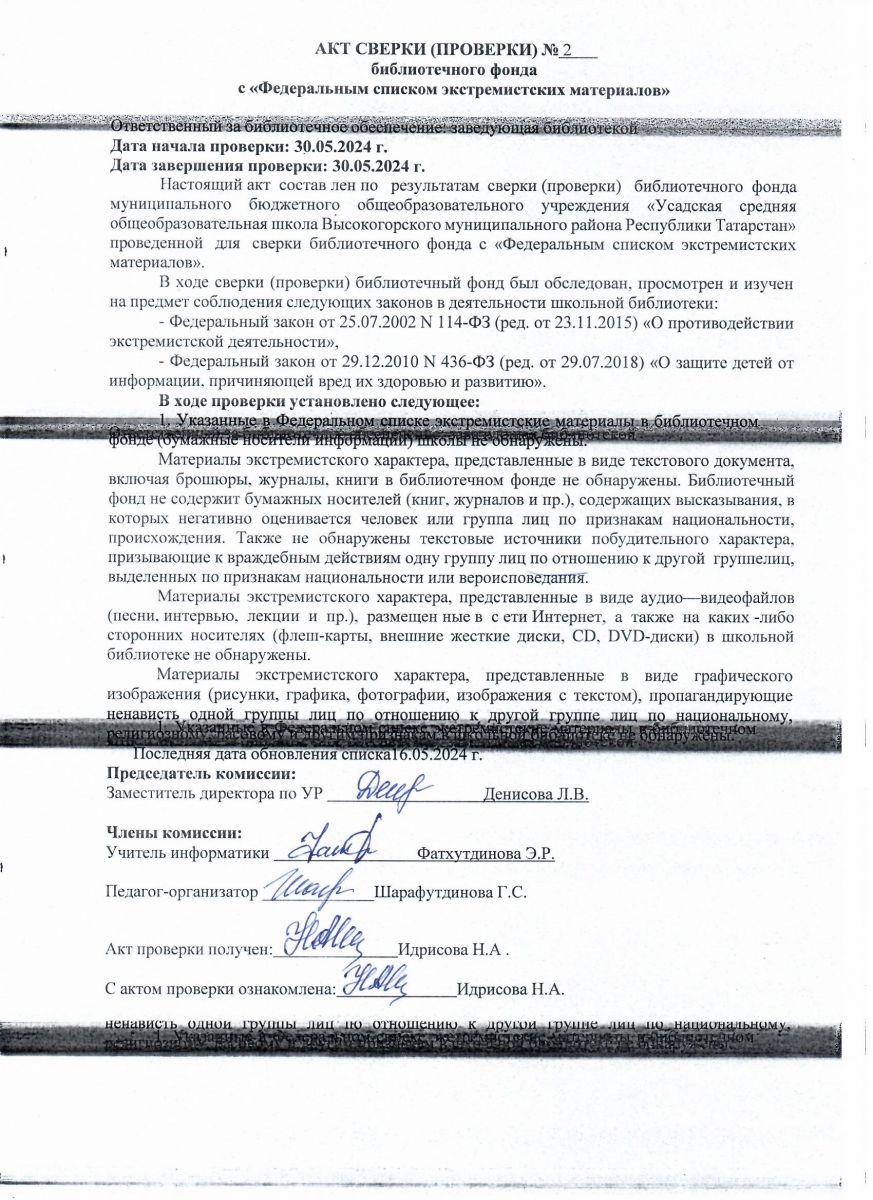 АКТ сверки библиотечного фонда с Федеральным списком экстремистских материалов 2024