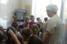 Шул уңайдан һәм шулай ук балаларда пешекче хезмәтенә ихтирам тәрбияләү максатыннан уртанчылар катнаш төркеме балалары тәрбияче апалары белән ашау пешерү блогының салкын цехына экскурсиягә керделәр. Иң элек пешекче апаларын котладылар, аңа тәмле ашлар пешергәне өчен үзләренең рәхмәтләрен әйттеләр. Аннары пешекче апалары аларга туклану режимы , һәр төр ашка туры килүче ризыклар, аларның сәламәтлеккә тәэсире турында сөйләде.