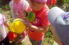 Кечкенәләр төркеме балалары тәрбияче апалары белән яшелчә түтәлләреннән помидор җыйдылар.