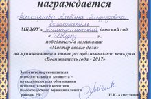 12 нче декабрьдә «Йолдыз» балалар бакчасында районның мәктәпкәчә белем бирү тәрбиячеләре арасында "Ел тәрбиячесе" дип исемләнгән һөнәри бәйге узды. Безнең балалар бакчасының дәрәҗәсен икенче кечкенәләр төркеме тәрбиячесе – Асылгариева Альбина Альфред кызы яклады. Үз үзен тотышы, сайлап алган эшенең остазы булуы белән күпләргә үрнәк булды, "Мастер своего дела" номинациясендә җиңү яулады.Котлыйбыз, тагы да югары уңышларга ирешүен телибез.