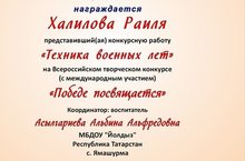 "Җиңүгә багышлана" дигән Бөтенроссия конкурсында катнашып, Халилова Раилә "Сугыш елы техникасы" дигән номинациядә, Гимадиева Фирүзә "Җиңү көне белән!"дигән картина белән, Исмагилова Земфира "Ветеранга бүләк" дигән кул эше белән беренче урын алдылар. Тәрбияче Асылгариева Альбина Альфред кызын һәм кызларны уңышлары белән котлыйбыз. Аларга рәхмәтебезне белдерәбез һәм иҗади уңышлар теләп калабыз.
